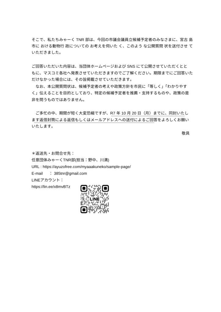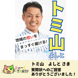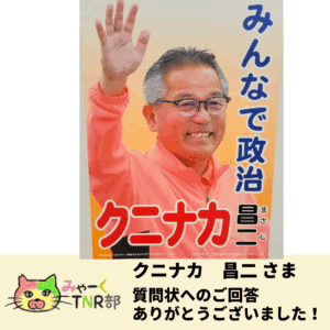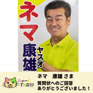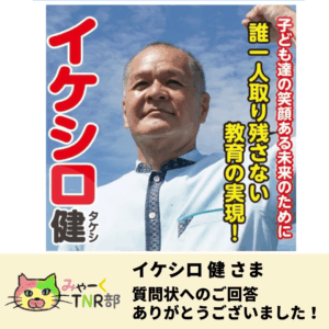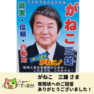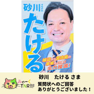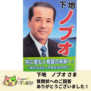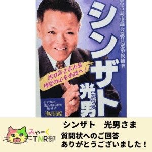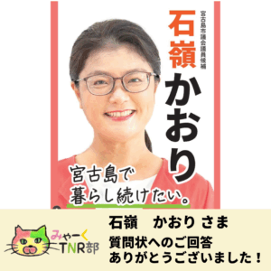みゃーくTNR部では、沖縄県宮古島市市議会選挙の候補者の皆様に、動物愛護行政に関する公開質問状をお送りさせていただきました。