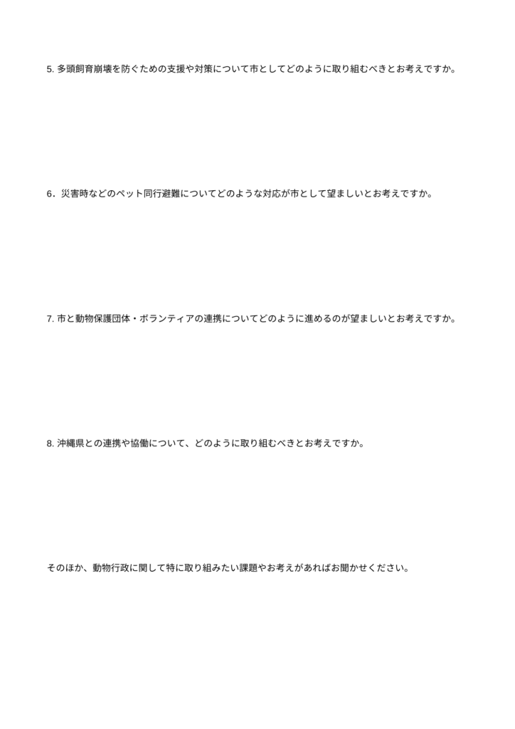 本市において、貴団体の取組等が功を奏し、ここ数年犬猫の殺処分ゼロを継続できていることは大変喜ばしいことです。一市⺠として心より感謝申し上げます。しかしながら、このゼロという数字は、譲渡会等、貴団体等の⺠間のボランティアの皆様のご尽力があってこそ成し得ております。収容場所についても現状の保健所の施設では、良い環境が整っているとは言い切れません。今後、殺処分ゼロ、収容ゼロを目指すためには、沖縄県と宮古島市、ボランティア団体、関係団体、市⺠が、動物愛護について共通の目標を設定することが必須であると考えます。